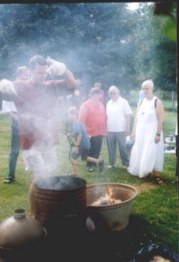 Das ganze Jahr über heize ich in unregelmäßigen Abständen den Raku-Ofen an. Der Ofen wird im weitläufigen Garten neben der Töpferei aufgebaut (Der